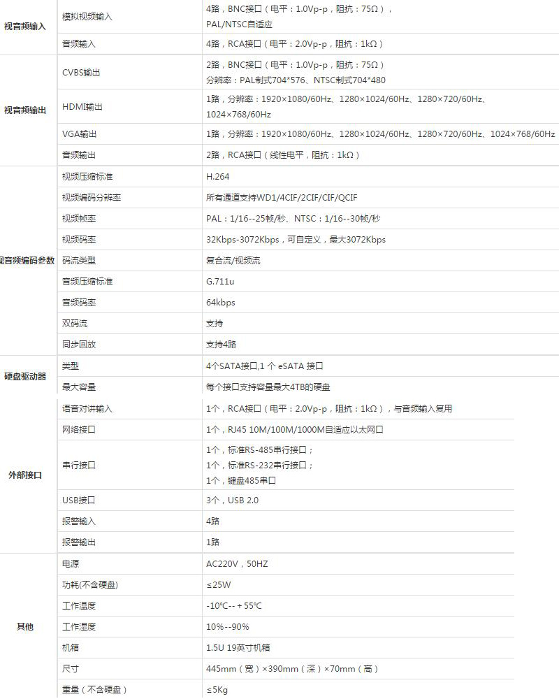 所有通道WD1分辨率(960*576)编码,支持4个SATA硬盘接口,1.5U机箱