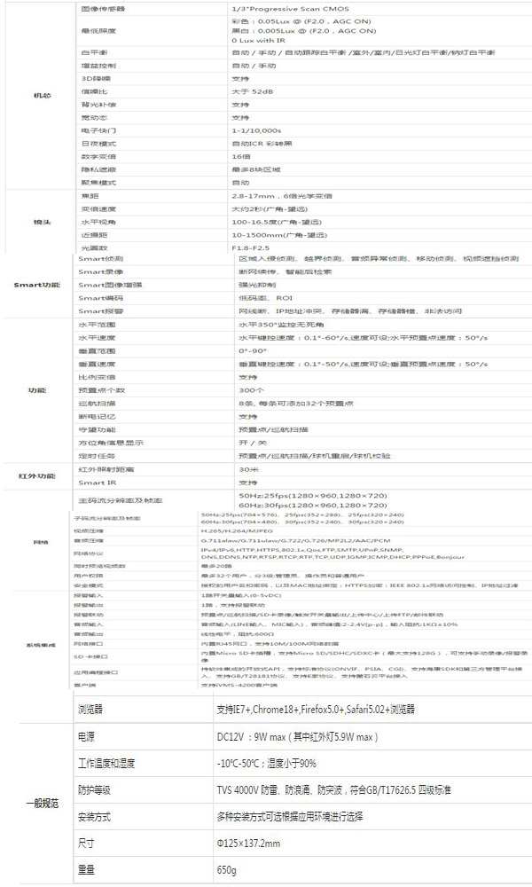 基本参数:130万像素2.5寸红外网络高清mini PTZ 摄像机,支持POE供电,支持6倍光学变倍,支持无线、音频、智能侦测,最大支持128G存储卡,H.265编码