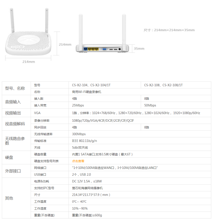 产品参数:无线传输速率300Mbps,内置1SATA接口支持3.5英寸硬盘(最大6T)